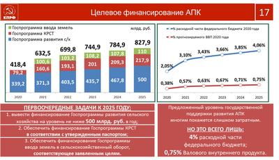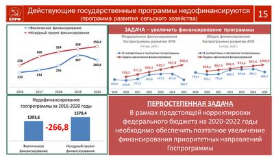 К примеру, государственная программа развития сельского хозяйства недофинансирована уже на 266,8 млрд. рублей! При этом на грядущий бюджетный период отклонение от паспортных значений программы сохраняется.