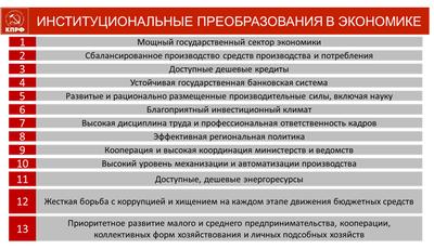 Основа обеспечения эффективного развития экономики – проведение масштабных институциональных преобразований, которые укрепят независимость, сформируют мощный государственный сектор экономики, укрепят финансовую систему, обеспечат справедливое распределение прибавочного продукта и природной ренты.