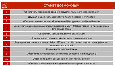 Мы сможем добиться и снижения пенсионного возраста, и обеспечить размеры пенсий на уровне не ниже 40% от заработной платы, а сами зарплаты увеличить двукратно. Нам удастся увеличить среднюю продолжительность жизни, обеспечить качественные и бесплатные образование и медицину, должный уровень жизни «детям войны», возродить стратегические отрасли промышленности, возродить русское поле на уровне 117 млн. гектар посевных площадей, и многое другое.