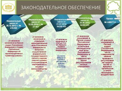 В результате нашей совместной работы увидели свет законы, направленные на создание действенного механизма контроля за оборотом заготовленной древесины, снижение масштабов незаконных рубок лесных насаждений (415-ФЗ), создание более эффективной системы осуществления лесохозяйственных мероприятий специализированными государственными учреждениями, совершенствование системы лесного семеноводства (27-ФЗ), развитие арендных отношений (250-ФЗ), упрощение доступа к заготовке древесины на основании договоров купли-продажи для малого и среднего бизнеса, обеспечение права добросовестных арендаторов лесных участков на заключение соответствующих договоров аренды на новый срок без проведения аукционов, совершенствование правил проектирования и предоставления лесных участков с учетом специфики определения их границ, осуществления кадастрового учета (206-ФЗ).