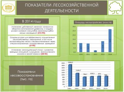 В 2014 году проведены мероприятия по лесоустройству на общей площади 26, 96 млн. га ( в 2012 году - 4,6 млн. га). Объем финансирования - 1,6 млрд. руб., в том числе более 1 млрд. руб. за счет субвенций федерального бюджета, 338 млн. руб. из средств бюджетов субъектов Российской Федерации и 245 млн. руб. за счет средств арендаторов.