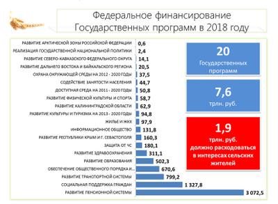 Всего 20 Государственных программ, на реализацию которых из федерального бюджета в 2018 году будет выделено 7 640 млрд. рублей, напрямую затрагивают интересы жителей сельских территорий, но фактически не уделяют им какого-либо внимания. Это и «Развитие здравоохранения» и «Развитие образования», и «Доступная среда», и другие.