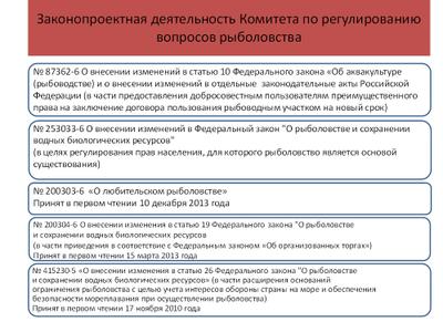 С законодательной точки зрения созданы необходимые условия – принят и с 1 января 2014 года вступил в законную силу Федеральный закон «Об аквакультуре (рыбоводстве)».