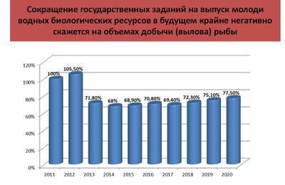 Сокращение государственных заданий на выпуск молоди водных биоресурсов на 22,5% от уровня 2011 года в будущем крайне негативно скажется на объемах добычи рыбы (в особенности сиговых и лососевых видов в Сибири на Дальнем Востоке).