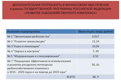 Учитывая необходимость развития рыбохозяйственной отрасли, Минсельхоз совместно с Росрыболовством разработан проект концепции федеральной целевой программы «Повышение эффективности использования и развитие ресурсного потенциала рыбохозяйственного комплекса в 2015-2020 годах». На ее реализацию требуются ассигнования в размере еще 50 млрд. рублей.