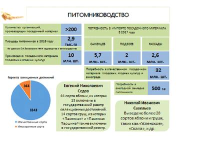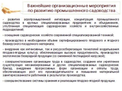 Не меньшую важность имеют вопросы широкого внедрения в производство научных достижений, повышающих привлекательность отрасли, товарность продукции садоводства, обеспечивающих благоприятные условия для ее производства и реализации, развитие хранения и товаропроводящей инфраструктуры.