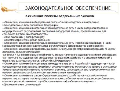Далее, что касается вопросов семеноводства, питомниководства, мелиорации, здесь тоже много проблем и законодательных пробелов.