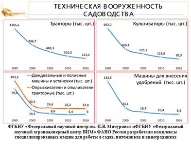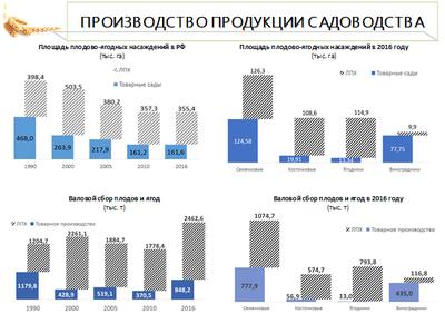 Мы потеряли значительное количество площадей по всем культурам (и семечковых, и косточковых, и ягодных). Особенно велико сокращение в товарном промышленном садоводстве. Это заставляет серьезно задуматься и определиться, сколько же необходимо иметь в промышленном товарном производстве садовых площадей, плодово-ягодных культур и винограда, сколько необходимо иметь в личном подсобном, фермерском хозяйстве. Это стратегически важная задача для решения проблемы импортозамещения. Для начала было бы неплохо восстановить хотя бы те 300 тысяч гектаров, на которые сократились площади с 1990 года.