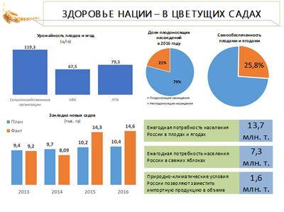 В последний период времени есть определенные успехи и в импортозамещении, существующая внешнеполитическая и экономическая ситуация подталкивает к решению этой задачи. В госпрограмме заложено 84-90 тысяч гектаров новых садов, которые необходимо ввести до 2020 года, с урожайностью на уровне 300-400 центнеров с гектара. Возможности такие есть, если действительно серьезно заниматься этой проблемой.