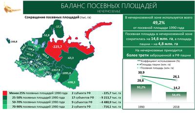 Некогда на этих территориях под посевами было больше 93% пахотных земель. Сегодня используется чуть больше половины имеющейся пашни или всего 49,2% от той площади, которая была в 1990 году. Больше трети заброшенных ценных земель находится в регионах нечерноземья.