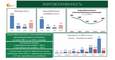 За рассматриваемый период произошло удвоение объемов внесения минеральных удобрений, парк сельскохозяйственной техники увеличился по тракторам с 744 тыс. ед. до 1,2 млн. единиц, по комбайнам – с 318 тыс. до 498 тысяч. При этом удвоилась энерговооруженность!
