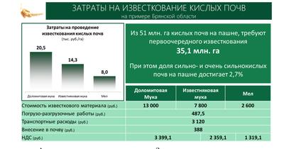 Аналогично по известкованию. Затраты на проведение полного известкования (внесения 6,5 тонн известковых материалов на гектар) составляют от 8 до 20 тыс. рублей на гектар в зависимости от того используется доломитовая мука или мел.