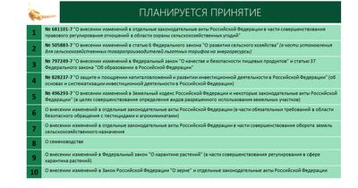 В ближайшем будущем планируется к принятию 10 законопроектов, в том числе те, над внесением которых мы совместно с Министерством сельского хозяйства ведем активную работу. Эти законодательные инициативы решают важнейшие вопросы, в том числе на направлениях установления для сельхозтоваропроизводителей льготных тарифов на энергоресурсы, обеспечения качества и безопасности пищевых продуктов, стимулирования инвестиционной деятельности, обеспечения безопасного обращения с пестицидами и агрохимикатами, совершенствования оборота земель, на направлениях развития семеноводства, обеспечения качества и безопасности зерна и продуктов его переработки.
