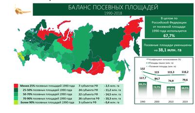 Площадь сельскохозяйственных угодий сократилась почти на 25 млн. га, площадь пашни – на 15,8 млн. га. И при всем этом по посевным площадям мы продолжаем толкаться на уровне 80 млн. га. Совсем недавно 117 миллионов гектар было.