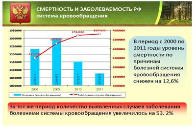 Предлагаю взглянуть на статистику по количеству умерших от болезней системы кровообращения, а также по количеству выявленных заболеваний системы кровообращения. Смертность по названной причине в период с 2000 по 2011 годы снизилась на 12,6%, но заболеваемость выросла больше чем в 1,5 раза (на 53,2%).