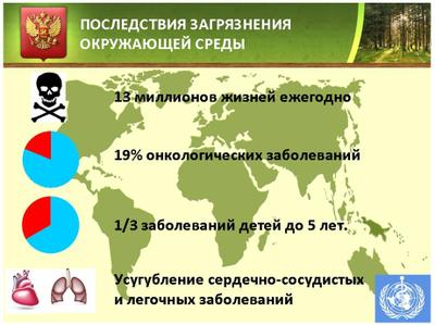 Так, 19% всех онкологических заболеваний, 1/3 всех заболеваний детей в возрасте до 5 лет, усугубление сердечно-сосудистых и легочных заболеваний – лишь начало длинного списка последствий, в том числе, загрязнения окружающей среды. При этом нельзя не учитывать того, что бульшая часть негативных свойств изменяющейся вследствие антропогенного воздействия окружающей среды еще не изучена.