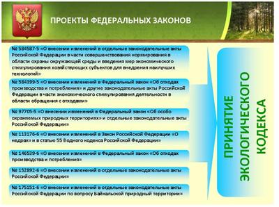 1. Проект федерального закона № 584587-5 «О внесении изменений в отдельные законодательные акты Российской Федерации в части совершенствования нормирования в области охраны окружающей среды и введения мер экономического стимулирования хозяйствующих субъектов для внедрения наилучших технологий».