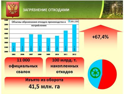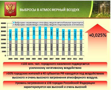 Также следует обратить внимание, по данным Министерства природных ресурсов и экологии Российской Федерации в 2011 году в России насчитывалось 119 городов с высоким и очень высоким уровнем загрязнения атмосферного воздуха. При этом в 2012 году их стало уже 138.