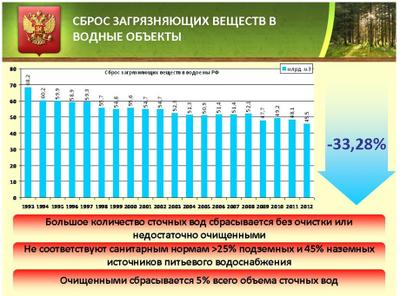 В результате, по данным Роспотребнадзора, более половины населения страны вынуждено использовать для питьевых целей воду, не соответствующую по ряду показателей установленным нормативам; почти треть граждан получает воду от источников водоснабжения без соответствующей водоподготовки; население ряда регионов страдает от недостатка питьевой воды и отсутствия связанных с этим надлежащих санитарно - бытовых условий проживания.