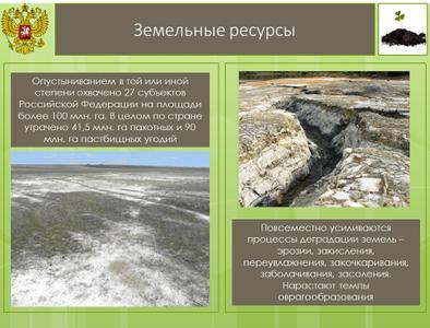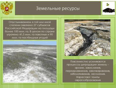 Повсеместно усиливаются процессы деградации земель – эрозии, закисления, переувлажнения, закочкаривания, заболачивания, засоления. Нарастают темпы оврагообразования. Опустыниванием в той или иной степени охвачено 27 субъектов Российской Федерации на площади более 100 млн. га. В целом по стране утрачено 41,5 млн. га пахотных и 90 млн. га пастбищных угодий. Кроме того, земельная реформа все больше перекашивается в сторону градостроительного направления при абсолютном игнорировании экологической ценности земель.