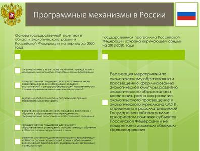 Основами государственной политики в области экологического развития Российской Федерации на период до 2030 года определены механизмы формирования экологической культуры, развития экологического образования и воспитания: