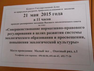 21 мая 2015 года состоялось расширенное заседание Высшего экологического совета на тему «Совершенствование нормативно-правового регулирования в целях развития системы экологического образования и просвещения, повышения экологической культуры». Заседание ВЭС вел заместитель Председателя ЦК КПРФ, Председатель Комитета Государственной Думы по природным ресурсам, природопользованию и экологии, действительный член РАН В.И. Кашин.