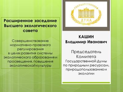 Предлагаем вашему вниманию доклад Председателя Комитета Государственной Думы по природным ресурсам, природопользованию и экологи В.И. Кашина на расширенном заседании Высшего экологического совета на тему: «Совершенствование нормативно-правового регулирования в целях развития системы экологического образования и просвещения, повышения экологической культуры».