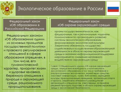 Сегодня, правовая основа для развития системы экологического образования и просвещения, повышения экологической культуры заложена в Федеральном законе «Об охране окружающей среды» и Федеральном законе «Об образовании в Российской Федерации».
