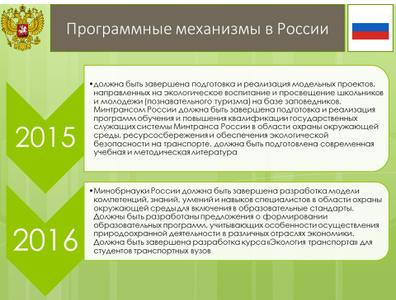 Внедрение этих механизмов приобрело плановый характер с принятием распоряжения Правительства Российской Федерации от 18 декабря 2012 года № 2423-р. Планом действий по реализации основ государственной политики в области экологического развития Российской Федерации на период до 2030 года, определены не только конкретные мероприятия и ответственные за их реализацию ведомства, но и конкретные сроки исполнения. При этом следует отметить, что 2015 и 2016 годы являются контрольными сроками реализации большинства из предусмотренных мероприятий.