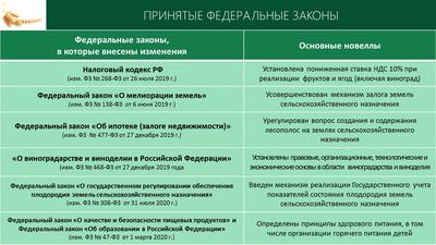 Так, нами были внесены принципиально важные изменения в Налоговый кодекс, снизившие ставку НДС на продукцию садоводства до 10%. Был принят базовый закон «О виноградарстве и виноделии в Российской Федерации», установивший правовые, организационные, технологические и экономические основы в области виноградарства и виноделия, определивший формы, условия и порядок осуществления государственной поддержки в данной области, установивший полномочия, в том числе контрольных, органов государственной власти и местного самоуправления, а также правовое положение лиц, осуществляющих деятельность в области виноградарства и виноделия.