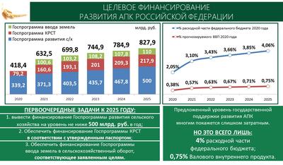 Государственная программа развития сельского хозяйства и регулирования рынков сельскохозяйственной продукции, сырья и продовольствия. Наиболее перспективная ее редакция была утверждена постановлением Правительства Российской Федерации от 19 декабря 2014 г. № 1421. Последующие 14 корректировок этой госпрограммы привели к тому, что отрасль недополучила почти 400 млрд. рублей федерального финансирования. В этой связи, в рамках работы по подготовке корректировок федерального бюджета на текущий год, а также предстоящей подготовки проекта бюджета на 2021-2023 годы, мы должны компенсировать сложившийся долг.