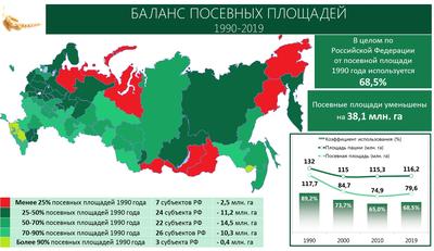 За период с 1990 года площадь земель сельхозназначения сократилась почти в два раза – осталось всего 383 миллиона гектар. Это катастрофа! Ни одна другая категория земель не была столь сильно урезана по площади за новейшую историю России! При этом площадь сельскохозяйственных угодий сократилась почти на 25 млн. га, площадь пашни – на 15,8 млн. га.