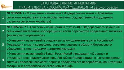 Мы также ведем работу над скорейшим внесением в Государственную Думу и других важнейших законодательных инициатив, в том числе, в области регулирования безопасного обращения с пестицидами и агрохимикатами, оборота земель, о семеноводстве, карантине растений, и других, которые эффективно вписываются в парадигму развития законодательства Российской Федерации в интересах сельскохозяйственных товаропроизводителей и укрепления продовольственной безопасности Российской Федерации.