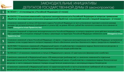 Приняты существенные изменения в закон «О качестве и безопасности пищевых продуктов», а также комплексные изменения в законодательство в части развития инвестиционной деятельности и поощрения капиталовложений в реальный сектор экономики Российской Федерации.