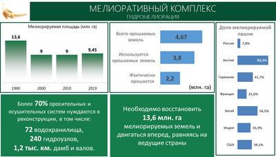 Докладывая на совещании у Председателя Правительства Российской Федерации наше видение задачи по вовлечению в севооборот заброшенных земель сельскохозяйственного назначения и, в первую очередь, пашни, мы обозначили, что эта работа фактически является второй целиной, ведь речь идет о 40 млн. га! В результате было подписано поручение о подготовке государственно программы вовлечения в оборот земель сельскохозяйственного назначения и развития мелиоративного комплекса Российской Федерации. Мы рассчитываем, что этот документ стратегического планирования будет утвержден уже в текущем году.