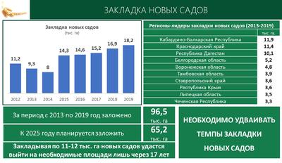 В 2019 году закладка новых садов достигла 18 тыс. га. В целом за период с 2013 года было заложено почти 100 тыс. га новых садов. Казалось бы, достигнутую динамику нужно сохранять и укреплять, но почему-то Министерство рапортует о планах ввести к 2025 году всего 65,2 тыс. га новых садов, то есть вернуться к тем 10-12 тыс. га в год, с которых мы фактически начинали. Такими темпами мы сможем выйти на требуемые площади только через 15-17 лет. А это не годится!