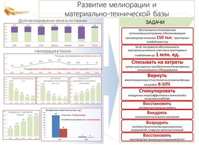 В России сегодня всего 7,8% мелиорированной пашни. Мы безнадежно отстали от США, где мелиорировано 39,1% пашни, Китая с 54,4% мелиорированной пашни, Индии с 35,9%, а также Франции, Германии, Англии и др. И это отставание стремительно увеличивается - Китай и Индия ежегодно вводят по 1,5 млн. га мелиорируемых земель, а в нашей госпрограмме до 2020 года заложены цели ввести в эксплуатацию всего 838 тыс. га таких земель.