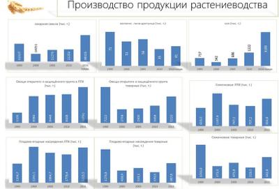 Если мы посмотрим на технические культуры, то и тут мы сможем увидеть положительный результат – валовые сборы сахарной свеклы, по отношению к 1990 году, увеличились на 16 млн. т. (в 1,5 раза), семян подсолнечника – на 7,2 млн. т. (в 3 раза), сои – на 2,4 млн. т. (в 4,3 раза). Валовой сбор овощей открытого грунта по сравнению с 1990 годом также вырос – на 5,8 млн. т. (в 1,5 раза). Аналогичная ситуация прослеживается также по отдельным сортам плодов и ягод.