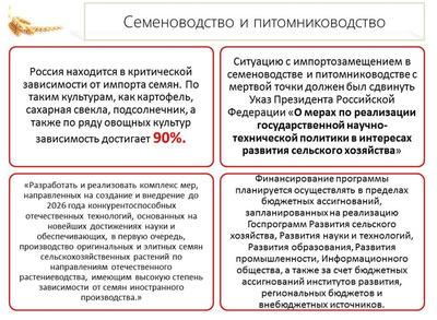Ситуацию с импортозамещением в семеноводстве и питомниководстве с мертвой точки должен был сдвинуть Указ Президента Российской Федерации «О мерах по реализации государственной научно-технической политики в интересах развития сельского хозяйства». Первым пунктом этого указа постановляется разработать и реализовать комплекс мер, направленных на создание и внедрение до 2026 года конкурентоспособных отечественных технологий, основанных на новейших достижениях науки и обеспечивающих, в первую очередь, производство оригинальных и элитных семян сельскохозяйственных растений по направлениям отечественного растениеводства, имеющим высокую степень зависимости от семян иностранного производства.