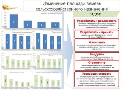 За четверть века в структуре земельного фонда площадь земель сельхозназначения сократилась почти в два раза. От 637,7 млн. га в 1990 году, к 2016 году у нас осталось немногим более 383 млн. га. Особую озабоченность при этом вызывает сокращение площади сельскохозяйственных угодий на 25 млн. га, из которых 17,2 млн. га пришлось на пашню.