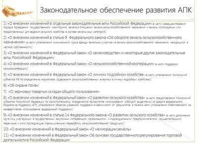 1) «О внесении изменений в отдельные законодательные акты Российской Федерации» (в части совершенствования порядка проведения государственного мониторинга земель в отношении земель сельскохозяйственного назначения и земель, используемых или предоставленных для ведения сельского хозяйства в составе земель иных категорий) ;