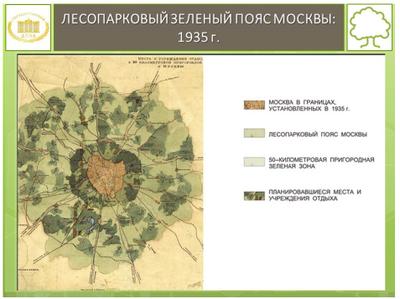 Создание лесопаркового защитного пояса вокруг Москвы впервые предусматривалось Генеральным планом реконструкции Москвы 1935 г.