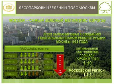 При оптимальном соотношении площадей крупнейших городов и пригородного лесопаркового защитного пояса должно быть не менее 1:5-1:10, а в Москве и Подмосковье оно составляет всего 1:1,5.