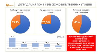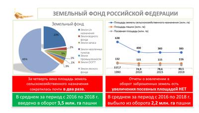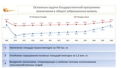 Мы проанализировали последние три года – 3,5 млн. га ввели в оборот, а 2,2 млн. вывели. Если эту тему оставить без государственного решения и сохранять текущую динамику, то в вопросе восстановления площади пашни и посевных площадей к уровню 1990 года мы уходим далеко за 60-70 лет! По сути это сравнимо с бездействием.