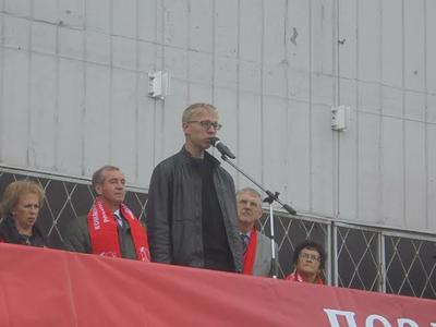 Первым выступил почётный гость – 99-летний Александр Александрович Ежевский, бывший министр сельскохозяйственного машиностроения СССР, который прибыл в Иркутск с делегацией землячества «Байкал» из Москвы. Он вспомнил, как 1 мая, ровно 85 лет назад, впервые прошёл по городу с колонной рабочих завода тяжёлого машиностроения им. В.В. Куйбышева. Ежевский говорил о необходимости возрождения иркутской промышленности, загубленной за 25 лет либеральных реформ, о необходимости новой индустриализации.