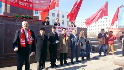 Днём красные кумачи заалели на площади В.И. Ленина: коммунисты, комсомольцы, патриоты и «дети войны», всего около 700 человек собрались на митинг. Член ЦК КПРФ, первый секретарь Якутского рескома КПРФ Виктор Губарев напомнил якутянам о том, каких достижений добилась Советская власть благодаря В.И. Ленину. Затем коммунисты возложили гирлянду и живые цветы к подножью памятника вождю мирового пролетариата.