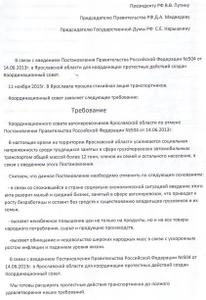 Член Координационного Совета автоперевозчиков С.В. Садиков зачитал требования автоперевозчиков к федеральным и региональным властям. Проект письма депутатов Ярославской областной Думы к Председателю Государственной Думы РФ и Председателю Правительства РФ подготовил и огласил депутат А.В. Воробьёв.