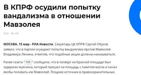 В КПРФ осудили попытку вандализма против Мавзолея Ленина на Красной площади и призвали наказывать за подобные акции. Об этом «РИА Новости» сообщил член Президиума, секретарь ЦК КПРФ Сергей Обухов.