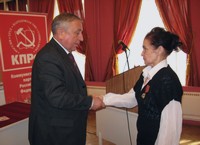 Семинар-совещание 27 апреляПомимо выступлений секретарей обкома и райкомов, сотрудников аппарата обкома, на семинаре состоялось также торжественное вручение наград и грамот ЦК. Высшей партийной награды - ордена "Партийная доблесть" - удостоена первый секретарь Зуевского райкома КПРФ Валентина Павловна Черемискина. Благодарственные письма от Центрального комитета были вручены членам кировской агитационной бригады под руководством Владимира Ивановича Осетрова, работавшей на выборах в Марий Эл и Республике Алтай.