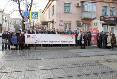 25 марта в Краснодаре в помещении общественно-политического центра состоялось собрание актива Краснодарского городского отделения КПРФ, экспертно-консультативного Совета «Народной приемной депутата С.П. Обухова» и представителей инициативных групп по месту жительства. Целью мероприятия стало обсуждение первых итогов работы общественной приемной, дальнейших планов работы народных активистов, а также обсуждение общественной инициативы о проведении городского референдума по актуальным вопросам развития Краснодара.